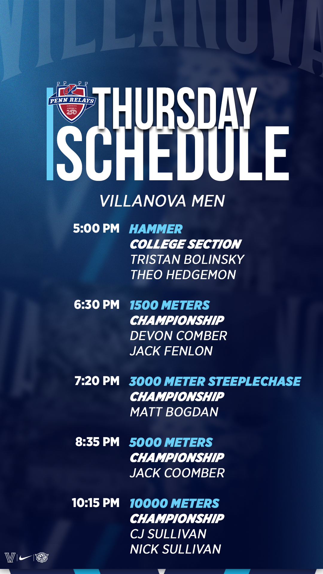 - Graduate student Tristan Bolinsky is the school record holder in the hammer with a mark of 58.56 meters recorded during the 2024 BIG EAST Championships. This is his fourth career Penn Relays for Villanova and first time competing in the hammer. He will compete in the discus for the fourth time in his Wildcats career tomorrow afternoon. Freshman thrower Theo Hedgemon competes in the first flight of the hammer and has surpassed 51 meters during his collegiate rookie campaign.